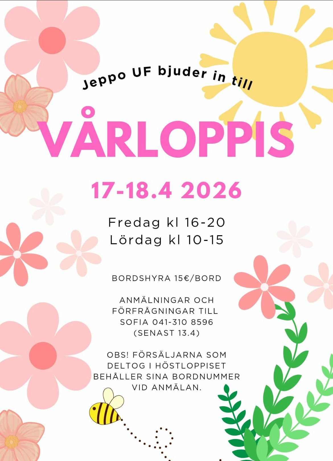 Vårloppis vid Jeppo UF. Bordshyra 15 euro. Anmälningar och förfrågningar till Sofia 041-3108596 (senast 13.4).